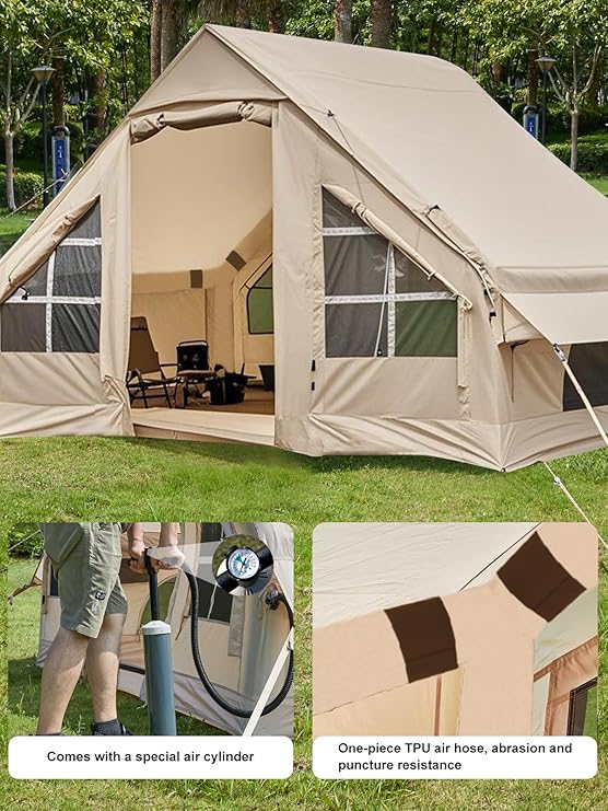 • 【EASY TO INSTALL INFLATABLE 】:The inflatable tent does not require manual installation of support poles, with a special one-piece PVC inflatable tube, there are 2 air inlets on the tent, by manually pumping the air through these two air inlets, remember to tighten the other inflation port during inflation,you can quickly inflatable tent erection. And the distribution of sun and rain shade canopy, so your travel journey more comfortable!
